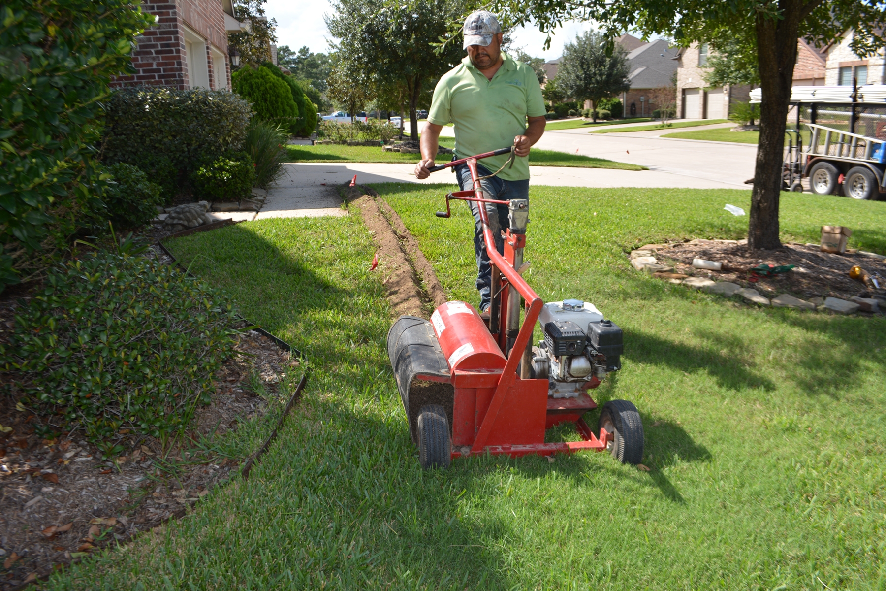Sprinkler trenching is the process of digging narrow channels in the ground to lay pipes for an irrigation system. These trenches allow water lines to run underground from the main water source to each sprinkler head. The trenches are carefully planned to ensure water flows evenly across the entire lawn.